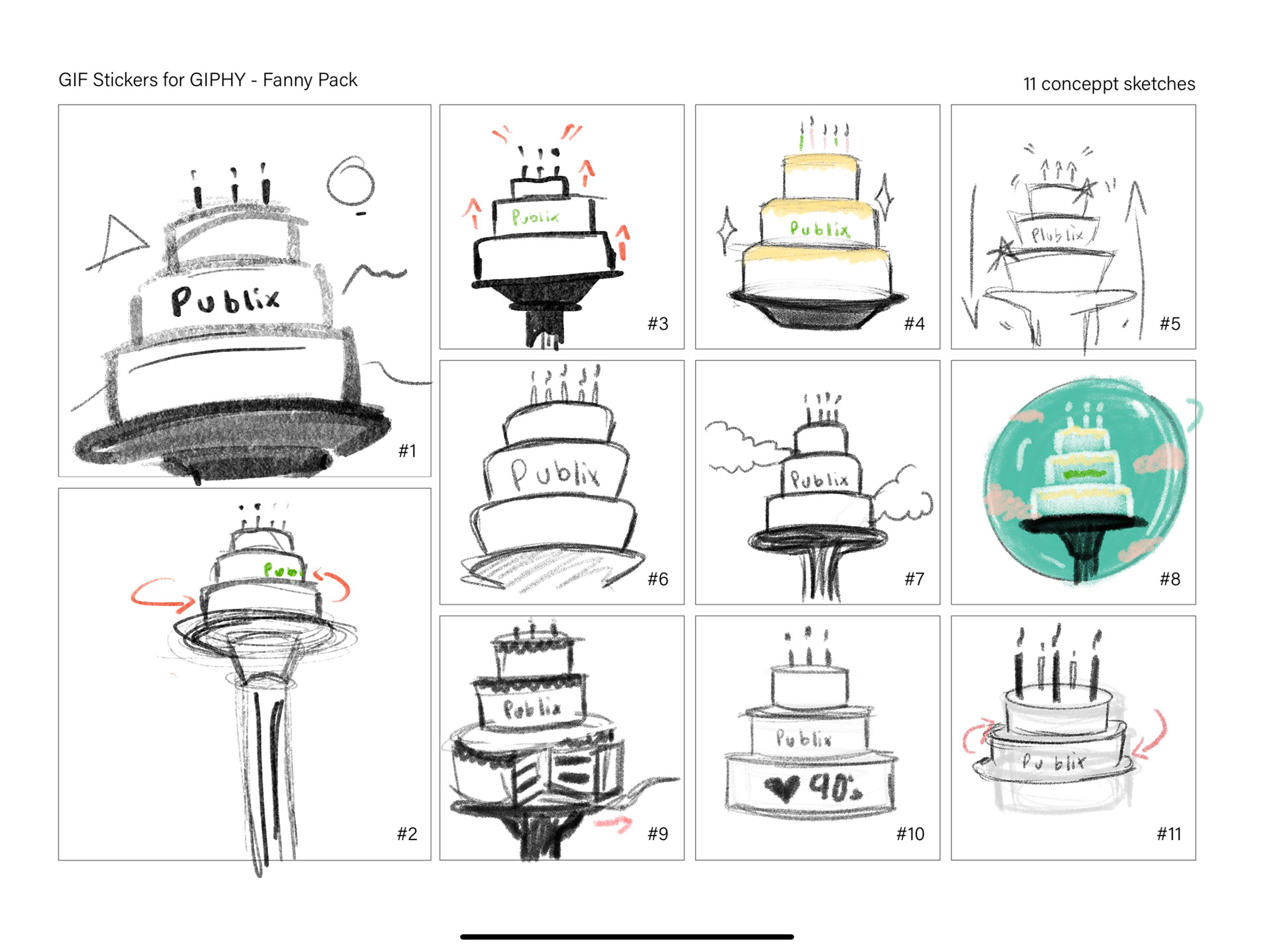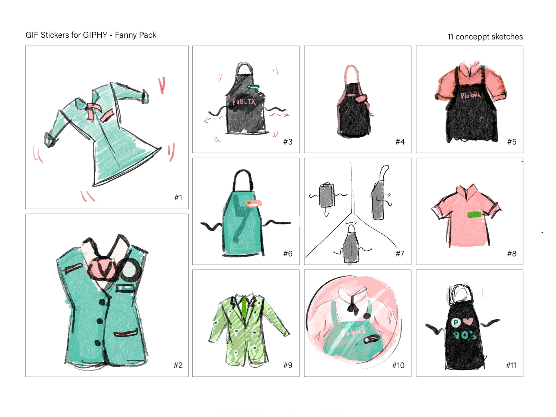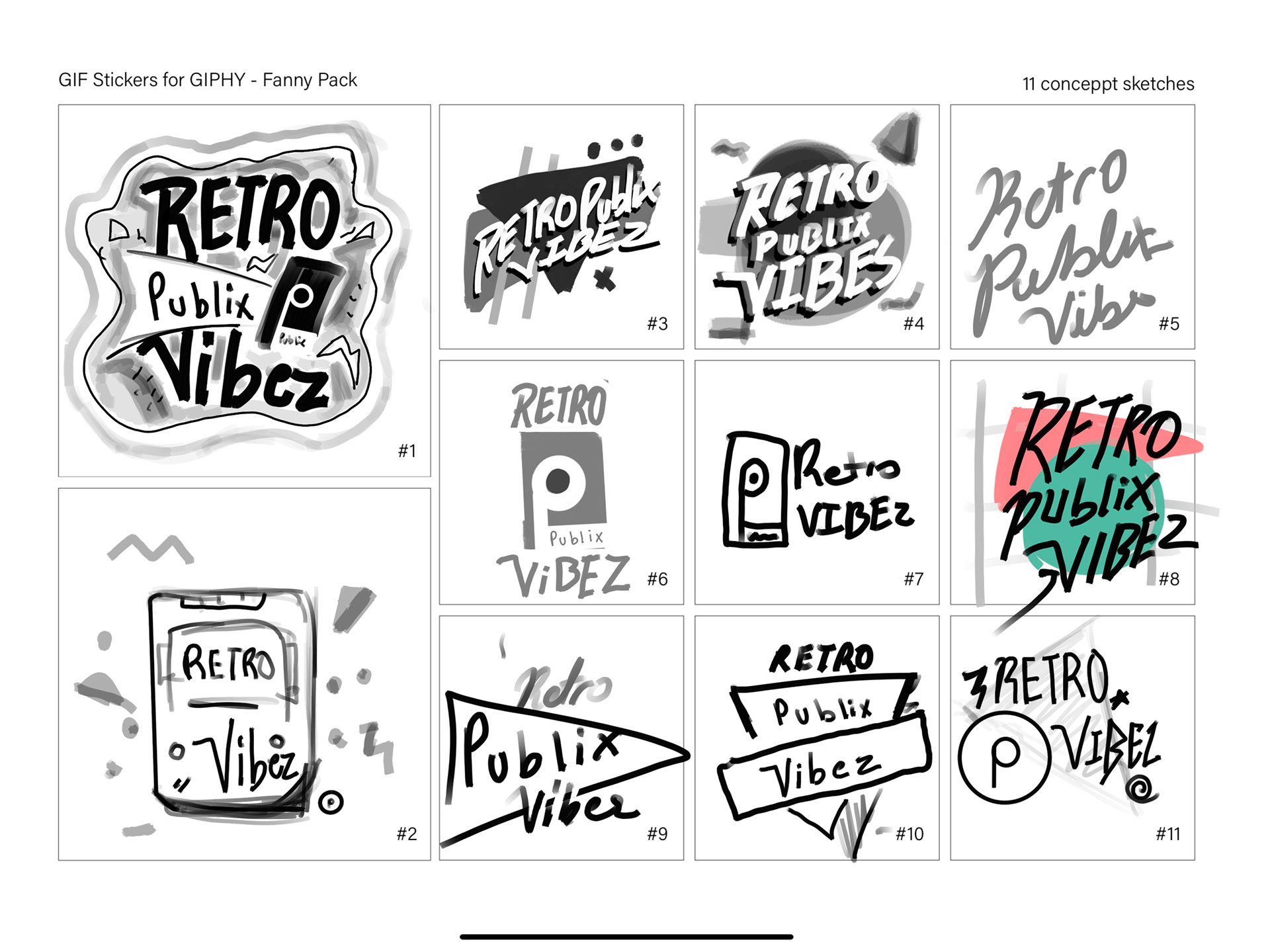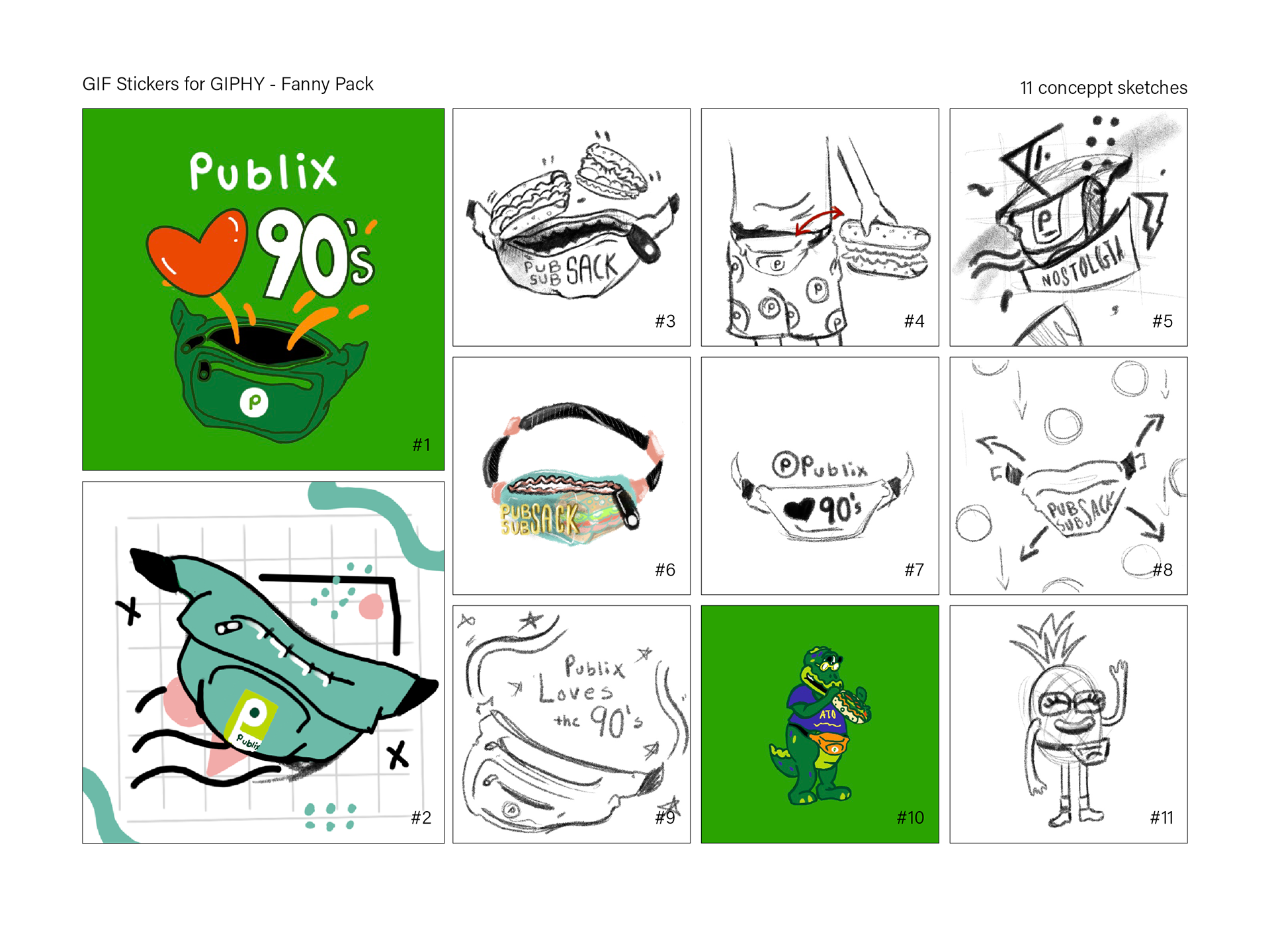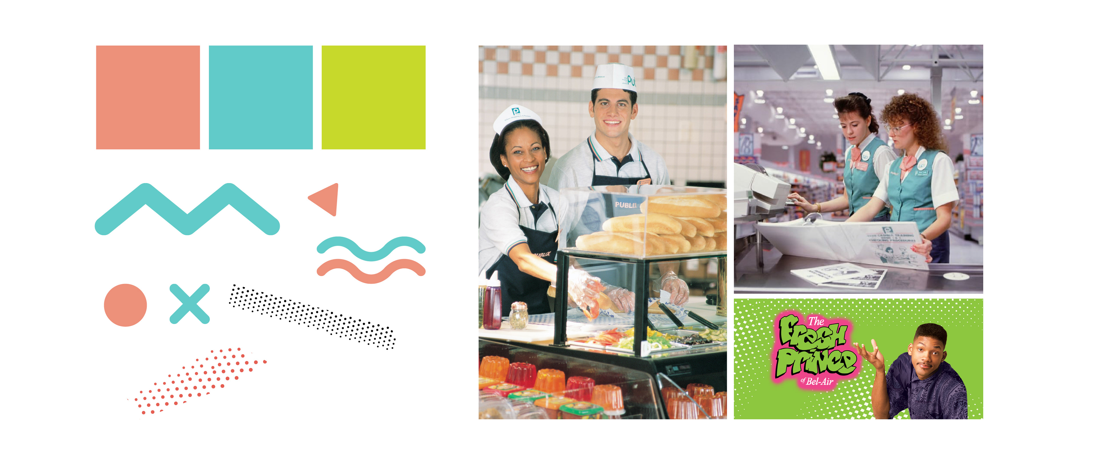 As the lead designer, I drew inspiration from throwback Publix photos, including the store's interior designs and uniforms. The visual development is influenced by 90s pop culture, but mainly Publix's stores, teal, and coral color palette. Regarding the T-shirt illustration, you may find a "Fresh Prince Flair" and a warm nostalgia toward our retro Publix icon GIPHY's, which garnered 7.3 MILLION views on their own.